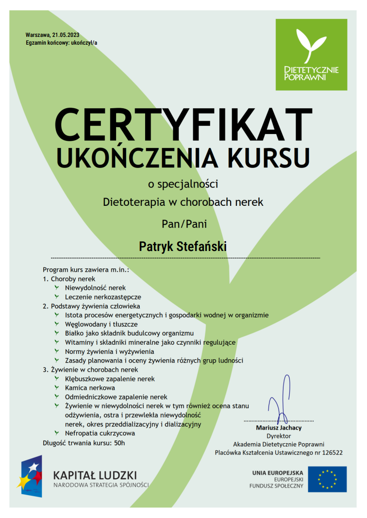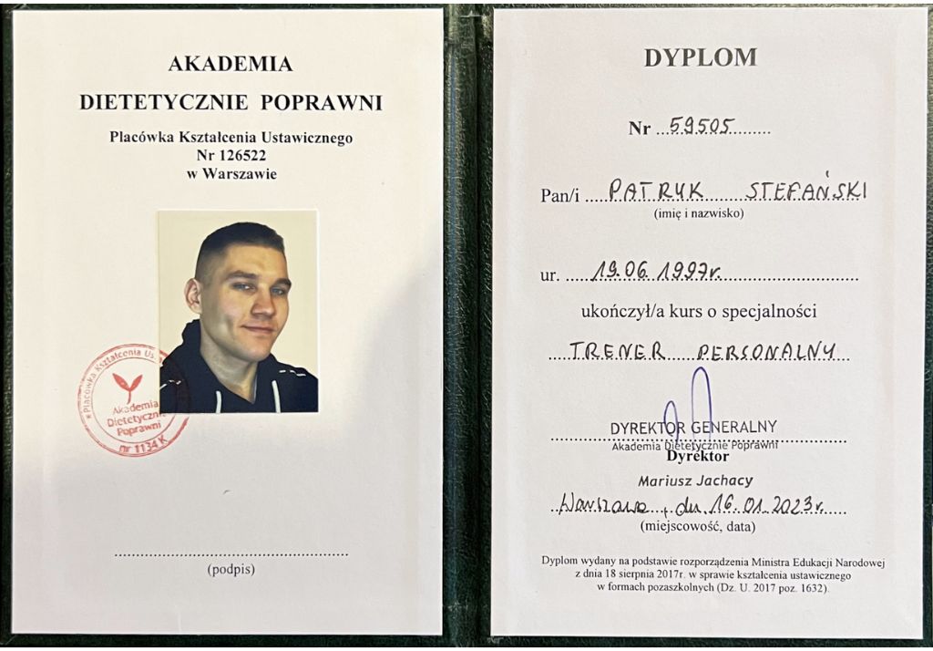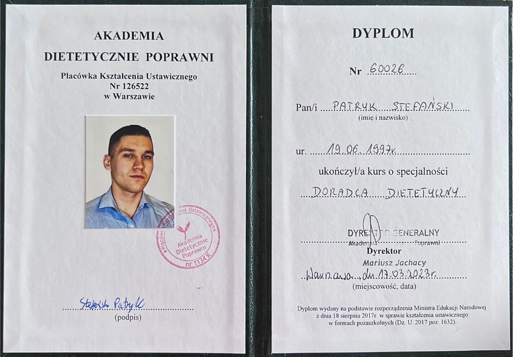 Nazywam się Patryk Stefański i jestem dietetykiem oraz trenerem online. Prowadzę profil edukacyjny na Instagramie fit.ojciec, gdzie dzielę się rzetelną wiedzą z zakresu żywienia, treningu i zdrowego stylu życia. Pracuję wyłącznie w oparciu o aktualne dowody naukowe oraz zdrowy rozsądek - bez skrajnych restrykcji, mitów dietetycznych i podejścia "wszystko albo nic". Pomagam uczyć się jeść w sposób, który prowadzi do realnych efektów i pozwala je utrzymać na lata, bez chaosu i frustracji. Regularnie poszerzam swoją wiedzę, śledząc najnowsze publikacje naukowe oraz uczestnicząc w specjalistycznych szkoleniach i kursach, co potwierdzają liczne certyfikaty.
